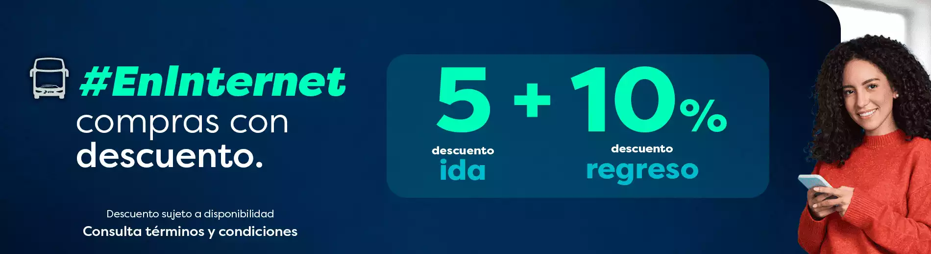 Obtén un 5% de descuento al comprar un boleto sencillo de ida y un 10% de descuento en el boleto de regreso. Estos descuentos están disponibles exclusivamente en nuestro sitio web etn.com.mx, a través de nuestro chatbot y en nuestra aplicación móvil ETN.