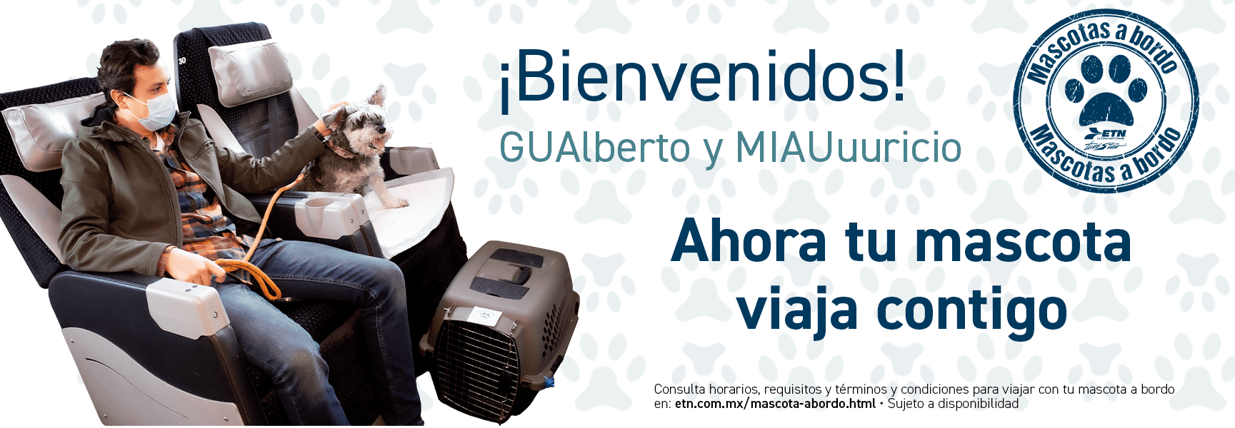 • El peso máximo de la mascota deberá de ser de 32 kg (incluyendo transportadora), las dimensiones máximas de la transportadora son: 128 cm de largo x 45 cm de ancho x 65 cm de alto. Solo se permite una mascota por transportadora.