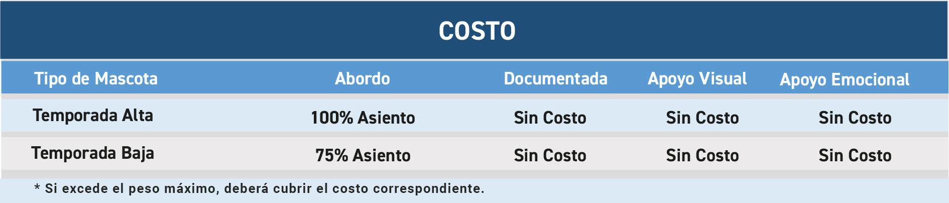 G) Se deberá cubrir el monto establecido para el traslado de la mascota de acuerdo a la temporada: Baja el 75% del valor del asiento; Alta el 100% del valor del asiento, ambos tomando de base la tarifa de adulto.